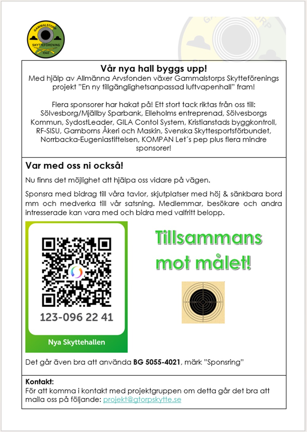 Vi lanserar nu en "Sponsorkampanj", som gör att den som vill kan vara med och bidra till vår skyttehall! Se information i bilden! Kortfattat innebär det att om man är intresserad av att hjälpa till och ro projektet i...